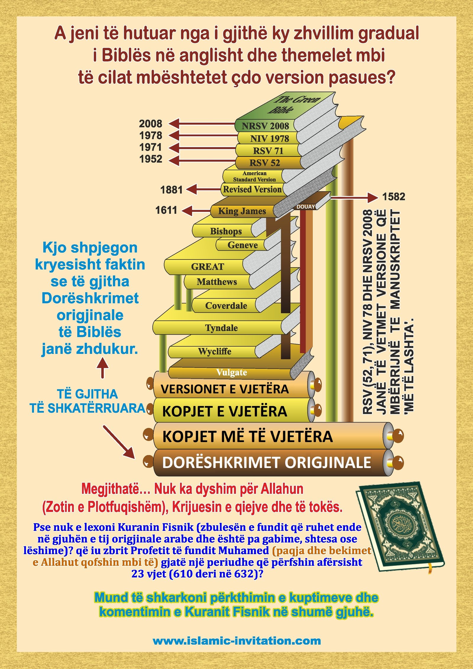 A jeni të hutuar nga i gjithë ky zhvillim gradual i Biblës në anglisht dhe themelet mbi të cilat mbështetet çdo version pasues? Kjo shpjegon kryesisht faktin se të gjitha Dorëshkrimet origjinale të Biblës janë zhdukur. Megjithatë… Nuk ka dyshim për Allahun (Zotin e Plotfuqishëm), Krijuesin e qiejve dhe të tokës. Pse nuk e lexoni Kuranin Fisnik (zbulesën e fundit që ruhet ende në gjuhën e tij origjinale arabe dhe është pa gabime, shtesa ose lëshime)? që iu zbrit Profetit të fundit Muhamed (paqja dhe bekimet e Allahut qofshin mbi të) gjatë një periudhe që përfshin afërsisht 23 vjet (610 deri në 632)? Mund të shkarkoni përkthimin e kuptimeve dhe komentimin e Kuranit Fisnik në shumë gjuhë.