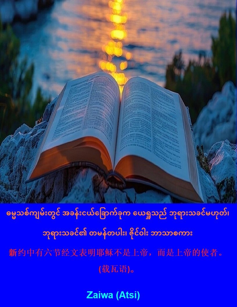 ဓမ္မသစ်ကျမ်းတွင် အခန်းငယ်ခြောက်ခုက ယေရှုသည် ဘုရားသခင်မဟုတ်၊ ဘုရားသခင်၏ တမန်တပါး၊ ဇိုင်ဝါး ဘာသာစကား 新约中有六节经文表明耶稣不是上帝,而是上帝的使者。 (载瓦语)。 - Chyoiyúng chyumlaiká: dangshikaq asik; Zaiwa Yohan 7:16 'Haû mù, Yesuq tû taî é gi, "Ngò mhoqshit é dang gi, Ngá é dang a nghut; Ngo lé nhang kat Su é dang ru nghut lhê.' Mahte 26:39 'Yesuq gi, haû mai ratsuí zo sô ê mù, myigùng má ngóm gop to luî, "Âwa ê, wó dut é nghut le gi, góm shí lé, Ngá chyáng mai lhaî pyám byi laq. Nghut kôlhang, Ngò ô nau é dông a nghut, Nàng ô nau é dông sheq nghut sháng gaq." ga kyûdûng ri.' Mahte 27:46 'Myinhtâng sum hkyíng kô má, Yesuq gi, "Eloi, Eloi, lama sabakhtani?" ga, htê mó èq garû kat ri. Hau é lichyúm gi, "Ngá Garai ê, Ngá Garai ê, Nàng, haî mù, Ngo lé tô pyâm tô lhê lhú?" gâ é nghut ri.' Markuq 10:18 'Haû mù, Yesuq gi, "Haî mù, Ngo lé ge é Sará nghu lhê lhú? Garai Gasang mai lai luî, ge é ó yuq le a nyì.' Markuq 12:29 'Haû jáng, Yesuq gi, "Ahkyak dik é jep é tarâ gi, 'Israelaq byu pé ê, gyo wú keq! Nga-nhûng é Yhumsîng Garai Gasang za, Garai Gasang nghut lhê. ' Markuq 13:32 'Buinyì eq ahkyíng haú lé gi, ó yuq le a sé; mauhkûng htoq mâ é maumang lagyô pé lháng a sé; haû Zo le a sé; haû Îwa za ru sê lhê.'