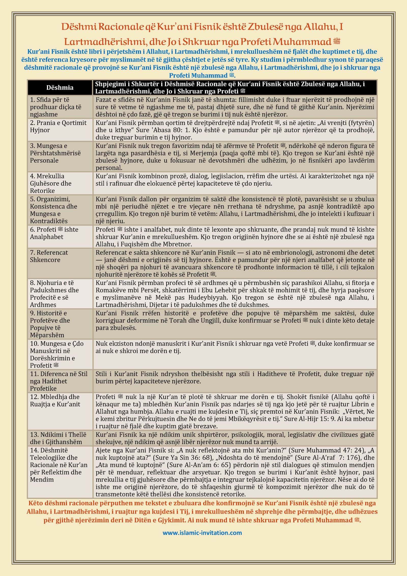 Kur’ani Fisnik është libri i përjetshëm i Allahut, i Lartmadhërishmi, i mrekullueshëm në fjalët dhe kuptimet e tij, dhe është referenca kryesore për myslimanët në të gjitha çështjet e jetës së tyre. Ky studim i përmbledhur synon të paraqesë dëshmitë racionale që provojnë se Kur’ani Fisnik është një zbulesë nga Allahu, i Lartmadhërishmi, dhe jo i shkruar nga Profeti Muhammad ﷺ.