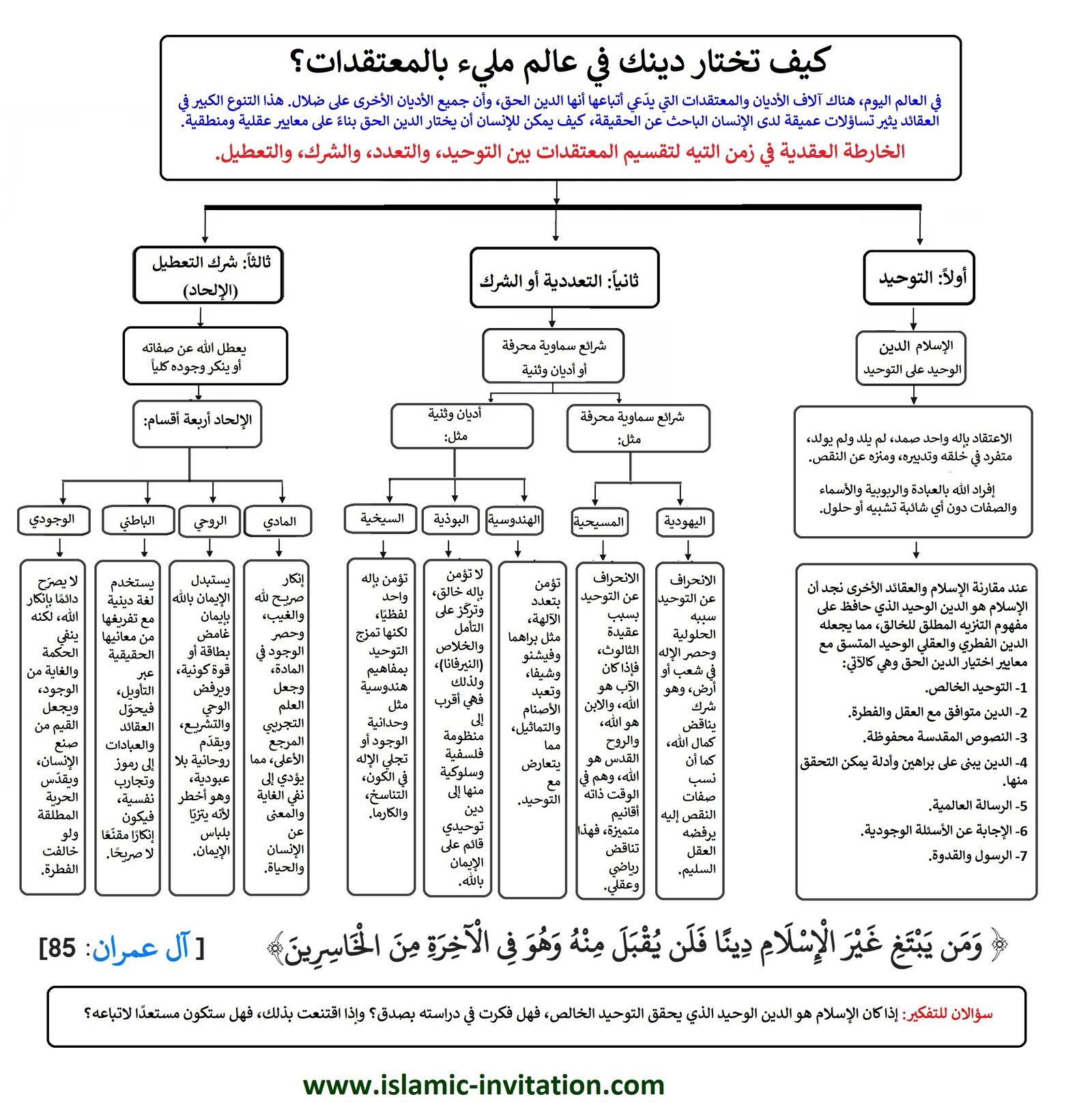 كيف تختار دينك في عالم مليء بالمعتقدات؟ خارطة تقسيم المعتقدات في زمن التيه بين التوحيد، والتعدد، والشرك، والتعطيل (لوحة حائط) إعداد الدكتور: سليمان خليل
