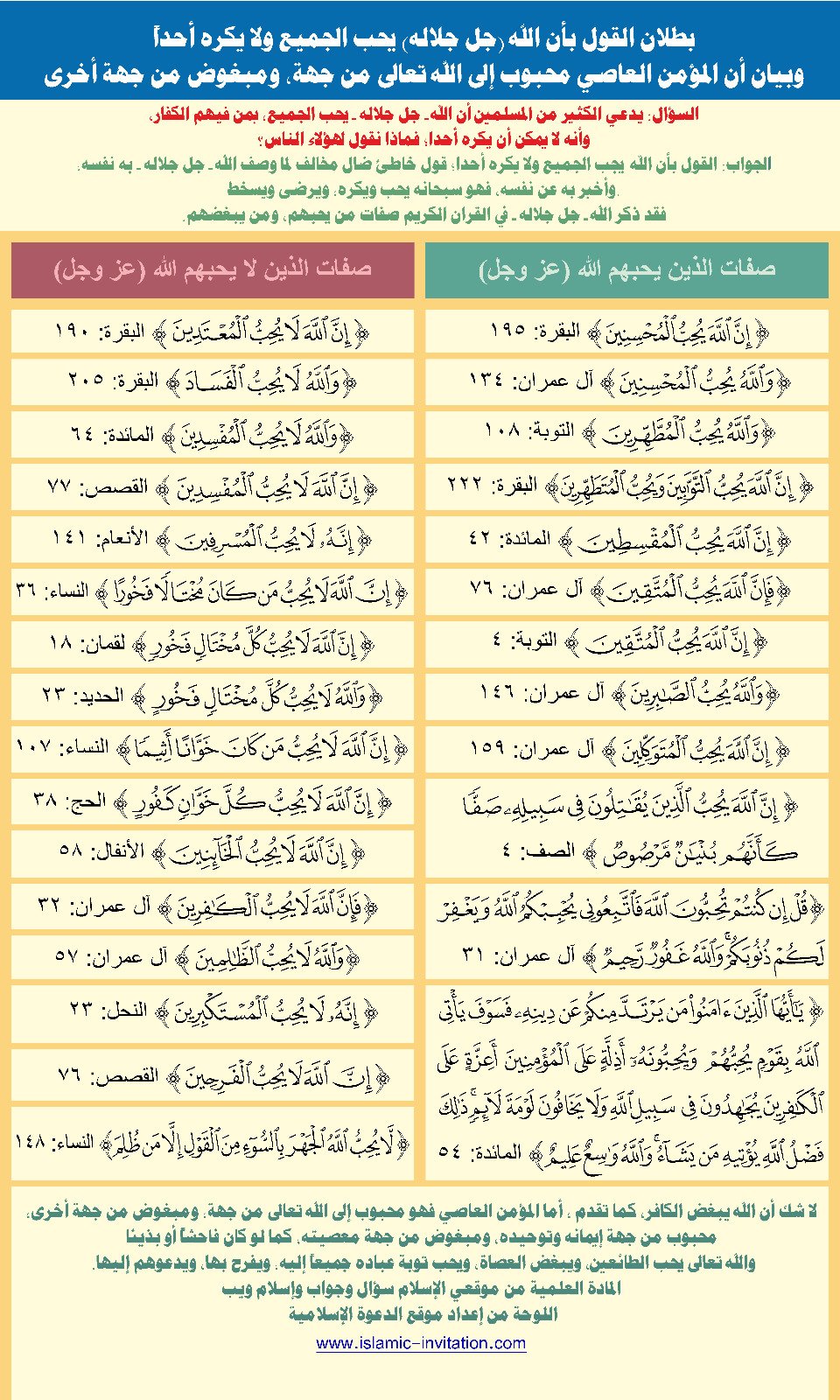 السؤال: يدعي الكثير من المسلمين أن الله يحب الجميع، بمن فيهم الكفار، وأنه لا يمكن أن يكره أحدا؛ فماذا نقول لهؤلاء الناس؟ الجواب: القول بأن الله يجب الجميع ولا يكره أحدا؛ قول خاطئ ضال مخالف لما وصف الله به نفسه، وأخبر به عن نفسه، فهو سبحانه يحب ويكره، ويرضى ويسخط. فقد ذكر الله في القران الكريم صفات من يحبهم، ومن يبغضهم