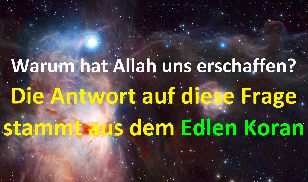 Die Antwort auf diese Frage stammt aus dem Edlen Koran - Allah der Allmächtige sagte: Und Ich habe die Ginn und die Menschen nur (dazu) erschaffen, damit sie Mir dienen. [51. Adh-Dhāriyāt: 56]